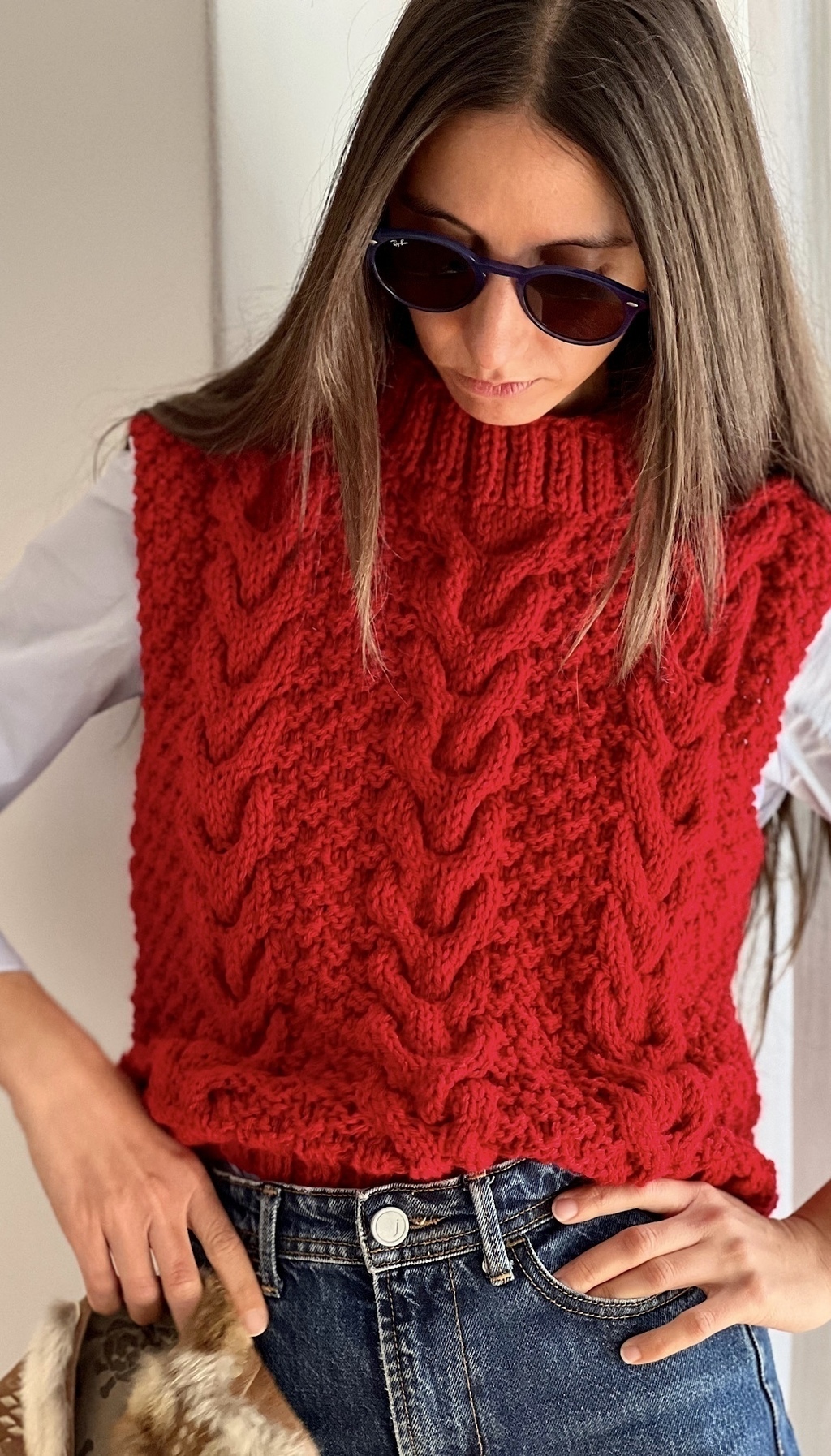 Chaleco tejido 100% a mano con tres trenzas en la parte delantera y dos trenzas en la parte trasera.